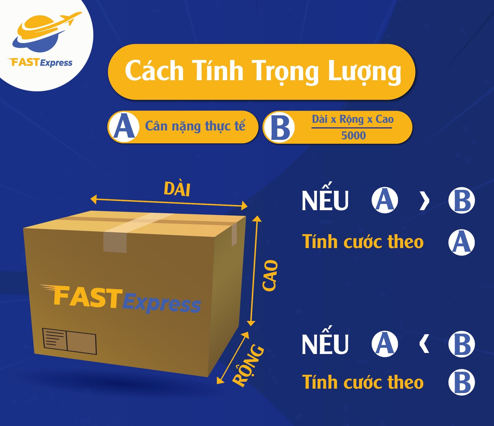 - Quý khách hàng lưu ý số kg tính cước sẽ là số kg cao hơn giữa cân nặng thực tế và trọng lượng quy đổi theo thể tích (Chiều dài x Chiều Rộng x Chiều Cao/5000)cm.